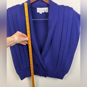 This vintage Russ sweater vest from the 1980s features a vibrant indigo/purple color with a double-breasted button waist, short cap sleeves, and vertical pleating across the front and shoulders. The cropped sleeveless fit gives it a bold, statement-making silhouette perfect for layering over blouses, tees, or dresses. A striking retro 80s knit vest full of colorful, structured charm.