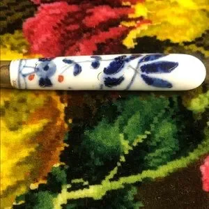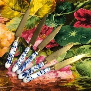 Elegant knives with floral ceramic handles. Perfect for dining or display. Hand painted handles and bronze metal, these are the cutest forks to serve with your fruit plates.