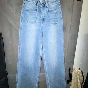Stylish light blue flare jeans. Comfortable and trendy. Perfect for casual wear.