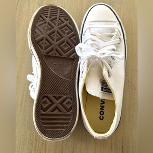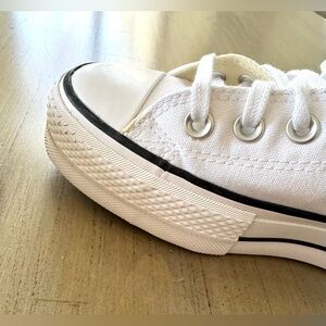 Platform Low top Converse in white canvas. Black trim and logo patch. Classic lace-up style. Clean, simple silhouette. Size 7. Gently used.
