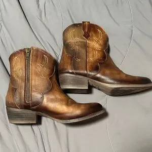 Genuine leather ankle booties with western-inspired stitching. Side zipper for easy on and off. Low stacked heel and rounded toe. Classic brown finish with subtle distressed patina.