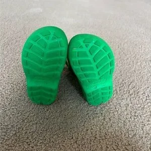 Bright green boots for rainy adventures. Easy to slip on. Durable and waterproof.