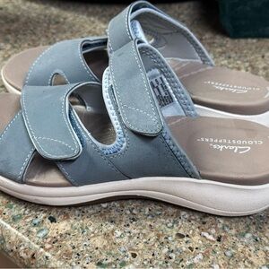 Clarks women's gray sandals with adjustable hook-and-loop straps for a customized fit. Soft cushioned footbed delivers all-day comfort. Lightweight design for easy wear and reliable support. Versatile grayish blue finish pairs well with casual outfits.(that spot is a water spot and dried after i took the pics) i think they are more of a grayish blue