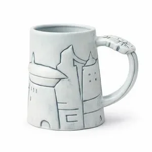 The mug has a beautiful stoneware-style matte glaze in a light blue / gray tone and a unique architectural design inspired by Black Spire Outpost on Batuu.