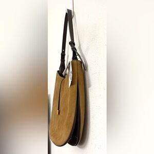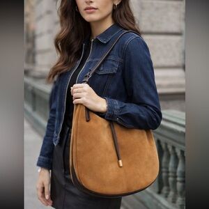 ZARA suede shoulder bag crafted from genuine cow leather in a warm Camel tone with brown leather trim and subtle gold hardware. The curved silhouette, strap detailing, and rich suede texture give this piece a refined equestrian-boho vibe that feels relaxed yet well-structured.