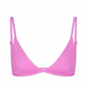 Sleek pink triangle bikini top in a vibrant pink hue. Designed for a flattering fit with adjustable straps and minimal coverage. Soft, stretchy fabric provides comfortable wear during beach and pool days. Stylish and simple pink swimwear for effortless summer looks.
