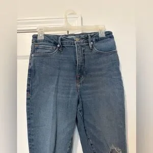 Stylish Good American distressed straight jeans in a classic medium wash denim. These flattering jeans feature trendy ripped knees, a raw frayed ankle hem, and a comfortable stretch denim fabric that hugs your curves while keeping its shape. Perfect for casual everyday wear, weekend outfits, or styled with heels and a blazer for an elevated denim look.