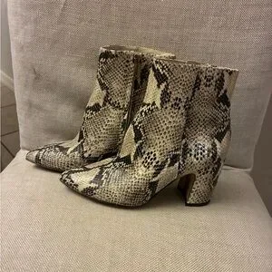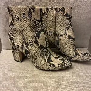 Sam Edelman ankle boots with bold snake-print. Pointed toe for a refined look. Sleek silhouette that elevates outfits. Easy to pair with dresses or denim. New