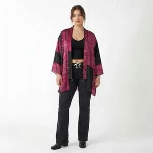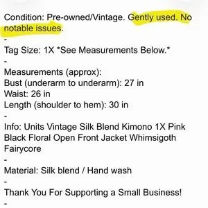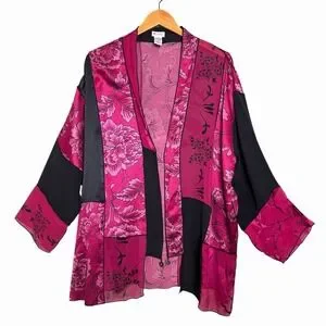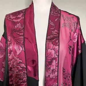 Info: Units Vintage Silk Blend Kimono 1X Pink Black Floral Open Front Jacket Whimsigoth Fairycore