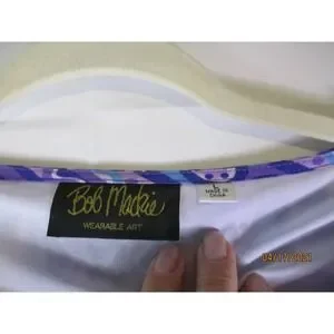 Chic Bob Mackie blouse with geometric patterns. Features lavender and sky blue hues. Lightweight and stylish.Kaftan with open scarf sleeves this is Very Feminine and well made out of 100 percent polyester chiffon. Similar blouse runs 70.00 at well known department store!