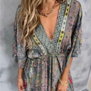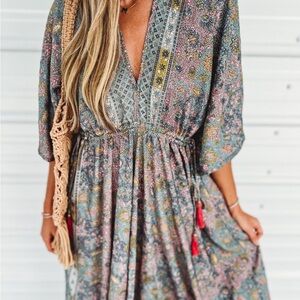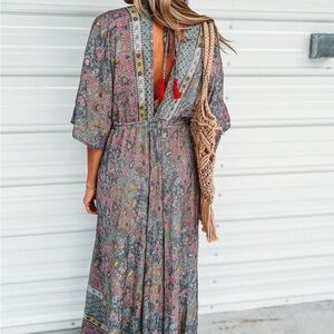Effortless boho maxi dress with a relaxed V-neck and elastic waist. Lightweight floral print in dusty blue and pink tones adds a feminine touch. Flowy sleeves and tassel accents create casual movement. Easy-to-wear style for everyday or weekend outings.