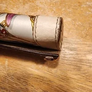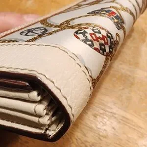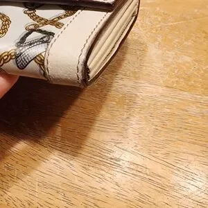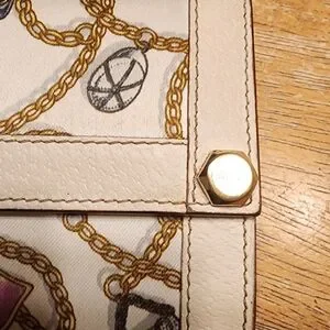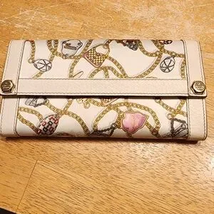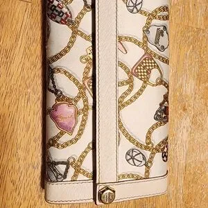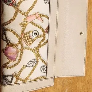 Elegant Gucci foldover wallet featuring printed chain and charm motifs. Cream exterior with gold-tone chain accents and subtle colored charms. Snap flap closure and organized interior layout. Refined accessory for daily use.