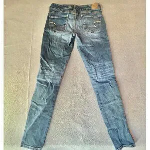 These American Eagle Outfitters skinny jeans offer a sleek silhouette with a super stretch fit, providing comfort and style. The medium blue denim complements a variety of tops and shoes.