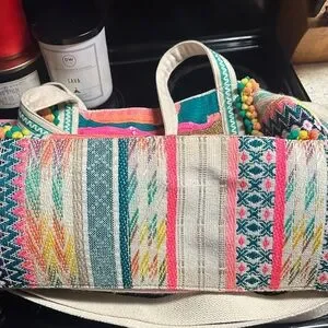 Vibrant and stylish tote bag featuring a colorful pattern. Perfect for adding a pop of color to any outfit.