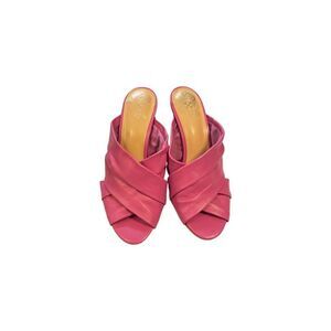 These Vince Camuto mules feature a vibrant pink hue and a stylish crisscross strap design, offering a chic and comfortable slip-on experience. The open-toe design and smooth texture make them perfect for casual summer outing