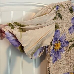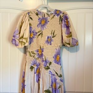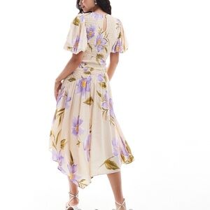 & Other Stories linen blend asymmetric hem midi dress with ruche bodice and volume sleeves in floral print