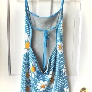 Blogger Favorite! Vibrant knit mini dress features a playful blue and white gingham backdrop accented by oversized white daisy floral motifs with sunny yellow centers. Designed with a flattering square neckline and delicate spaghetti straps that crisscross over an open back for a breezy, summery feel. The stretchy, body-hugging knit fabric provides both comfort and a structured silhouette, making it an ideal choice for festival season or casual daytime outings.