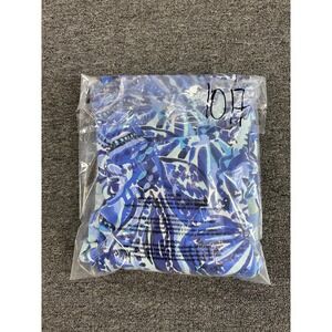 Color/Pattern: Blue, navy, aqua, and white tropical floral and abstract print.