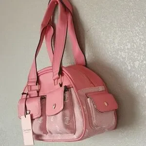 Charming pink shoulder bag by Juicy Couture. Features heart-shaped accents and dual front pockets. Perfect for adding a pop of color.