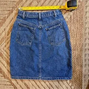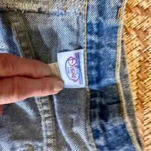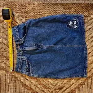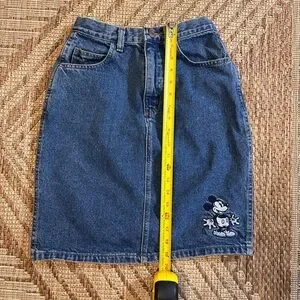 Classic vintage Disney blue denim skirt with playful Mickey embroidery at the hem. Mid-rise fit with belt loops and front seam for easy styling. Versatile blue color pairs well with tees, blouses, and jackets.