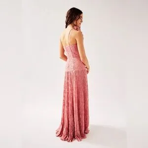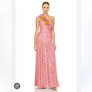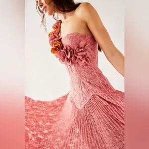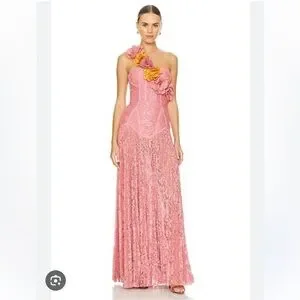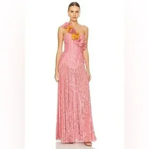 PatBO Hand -Embroidered Lace bustier pink Gown|Rose-One-Shoulder Floral Appliqué