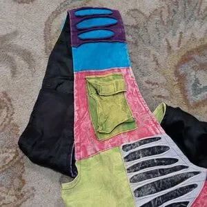Bright pink patchwork shoulder bag with playful twin cat appliqués. Multicolor accents include teal, yellow, purple, black and red. Soft fabric construction with a wide, patterned strap. Fun, artsy statement piece. Perfect for casual outings.