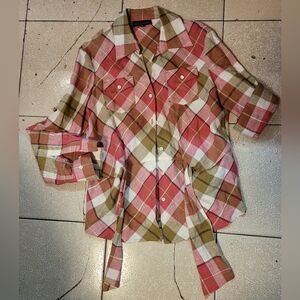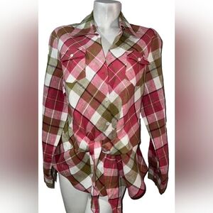 Plaid button-up shirt with subtle chest detail. Roll-tab sleeves and tie-waist styling. Lightweight woven fabric with soft color blocks. Casual versatile piece.