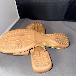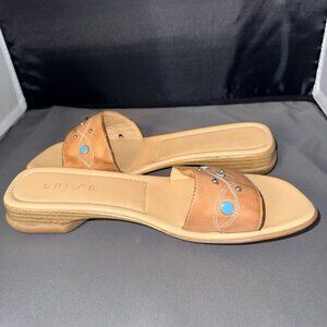 Unisa TONKA Slide Sandals Womens 7B Chunky Heel Camel Leather Beaded Spain. Chunky heel slide sandals with wide cross strap embellished with curved topstitching and large beads.