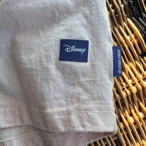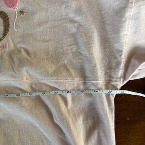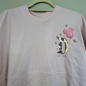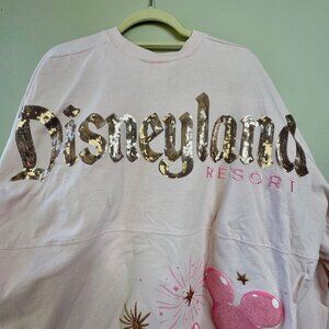 Soft pale pink sweatshirt from Disney featuring a large sequin “Disneyland Resort” logo across the chest and adorable pink Mickey balloon graphics with sparkly fireworks accents.