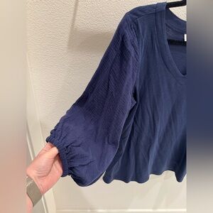 Chic navy blouse with textured sleeves. V-neck design for versatile styling. Bundle to save, offers accepted!