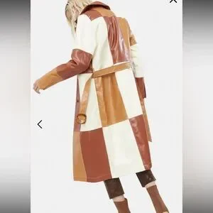 Stylish colorblock faux-leather trench in brown and cream. Tailored silhouette with a waist belt for a flattering fit. Smooth finish and notch lapel add polished detail. Versatile outerwear that elevates casual or dress looks.