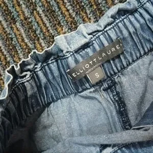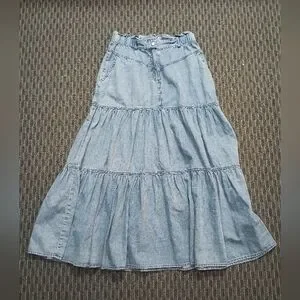 Soft light-blue denim skirt by Elliott Lauren. Tiered silhouette with gentle gathers. Elastic waistband and front button detail. Casual and flowy design.