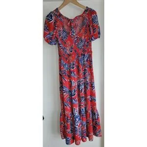 Sincerely Jules Women's Floral Midi Red Dress M Tropical Ruched Tie Back Resort