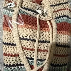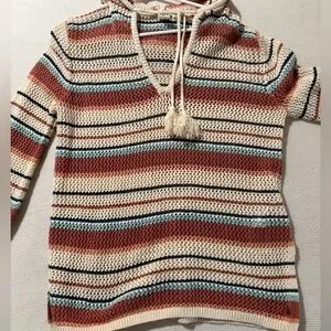 Soft knit striped sweater with a flattering V-neck and playful tassel ties. Lightweight, breathable fabric for comfortable all-day wear. Cream and rust stripes with subtle teal and navy accents. Easy to style for casual outfits.