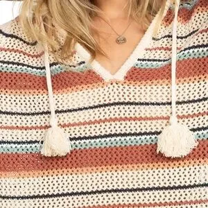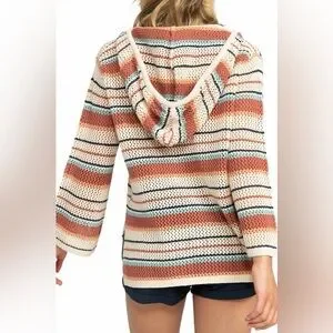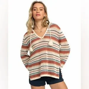 Roxy Striped V-Neck Hooded Knit Sweater with Tassel Ties - Cream & Rust