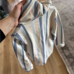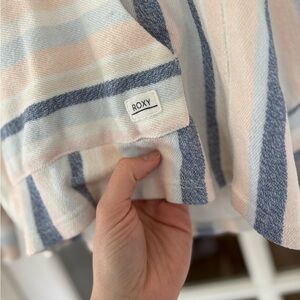 Soft striped hooded pullover by Roxy. Lightweight knit with a front pouch pocket. Relaxed fit for easy layering. Classic vertical stripe pattern for casual style.
