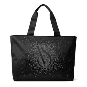 Victoria’s Secret shine tote, VS sparkle tote, black glam tote bag, rhinestone logo tote, oversized carryall bag, weekender tote, travel tote bag, statement tote, y2k glam bag, large shopper tote, zip top tote bag, black sparkle bag, polyester tote