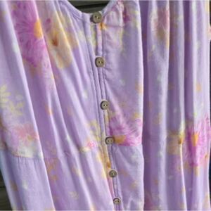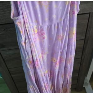 Charming maxi dress with a flowy silhouette. Features delicate floral patterns in lavender and pink. Perfect for a graceful look.