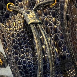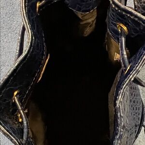 This stylish blue croc-embossed bucket bag is perfect for any occasion. Its sleek design and gold accents add a touch of luxury to your outfit. Features a prominent gold medallion logo.