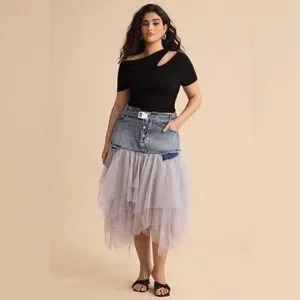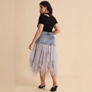 Chic high-low skirt with blue denim top. Flowy gray tulle layers. Perfect for modern style.