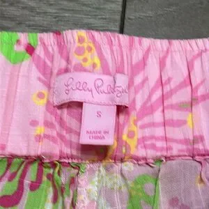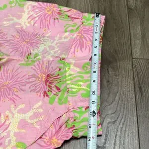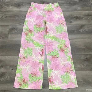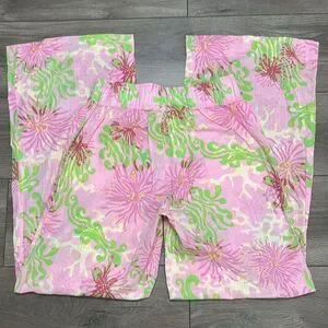 Lilly Pulitzer Mid Rise Wide Leg Pants Pink Green Size Small. Excellent condition. Light and airy 100% cotton fabric. Pull on pants with the elastic stretch waistband. Front pockets. See pictures for measurements.