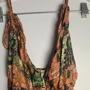 Lets Smock About it Bohemian dress by Intimately Free People. Features a blend of vibrant colors and floral patterns. Size small in Good used condition. Adjustable tie straps.