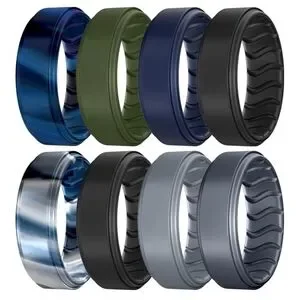 Durable silicone rings perfect for active lifestyles. Available in black, blue, green, and gray. 8 count
