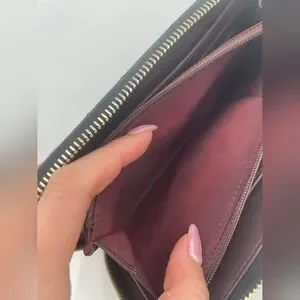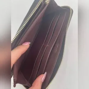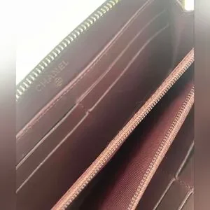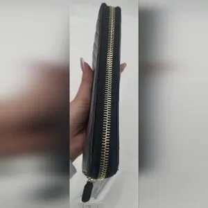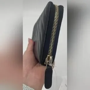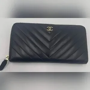 Sleek CHANEL wallet in black with chevron pattern. Features gold-tone logo and zipper.