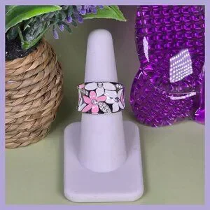 This ring tells the story of blooming gardens with its intricate pink and white enamel flowers, accented by sparkling stones. A charming piece of jewelry to adorn your hand, it captures a balance of elegance and playfulness.