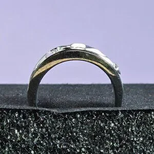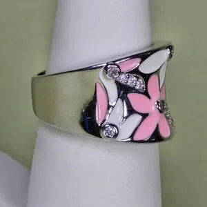 Silvery Pink & White Enamel Floral Ring With Sparkling CZ Size 7