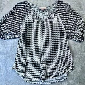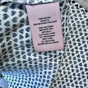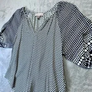 Keywords: philosophy, heart print, Philosophy Republic Clothing women blouse, heart print top, women's V-neck blouse, rayon blouse women, black and white heart print shirt, lightweight summer blouse, boho women top, casual work blouse, short sleeve patterned blouse, women size XS top, relaxed fit blouse, romantic print women shirt, Philosophy brand top