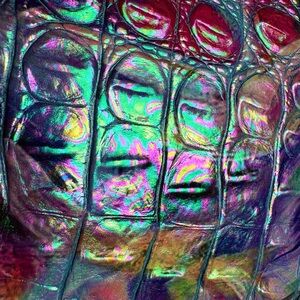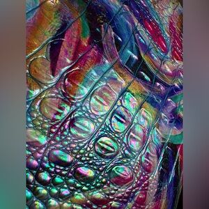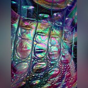 Featured in Elope Melbourne, a creative combination of color designed to ignite the imagination. Enter a world of whimsy with this playful print that has iridescent shine bringing a glow to the season. Made with genuine croc-embossed leather.