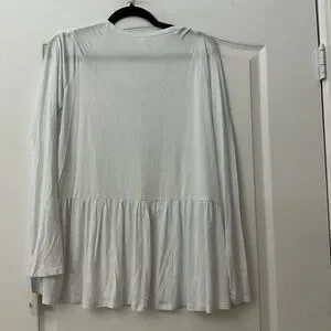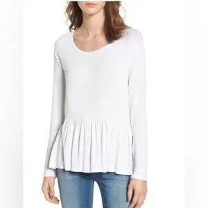 Soft scoop neckline. Lightweight, flowy peplum hem. Long sleeves for versatile wear. Simple, breezy silhouette for layering or solo wear.