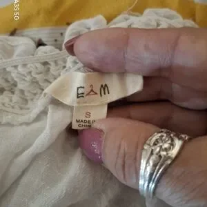 E M White Off-Shoulder Top with Blue Embroidery
